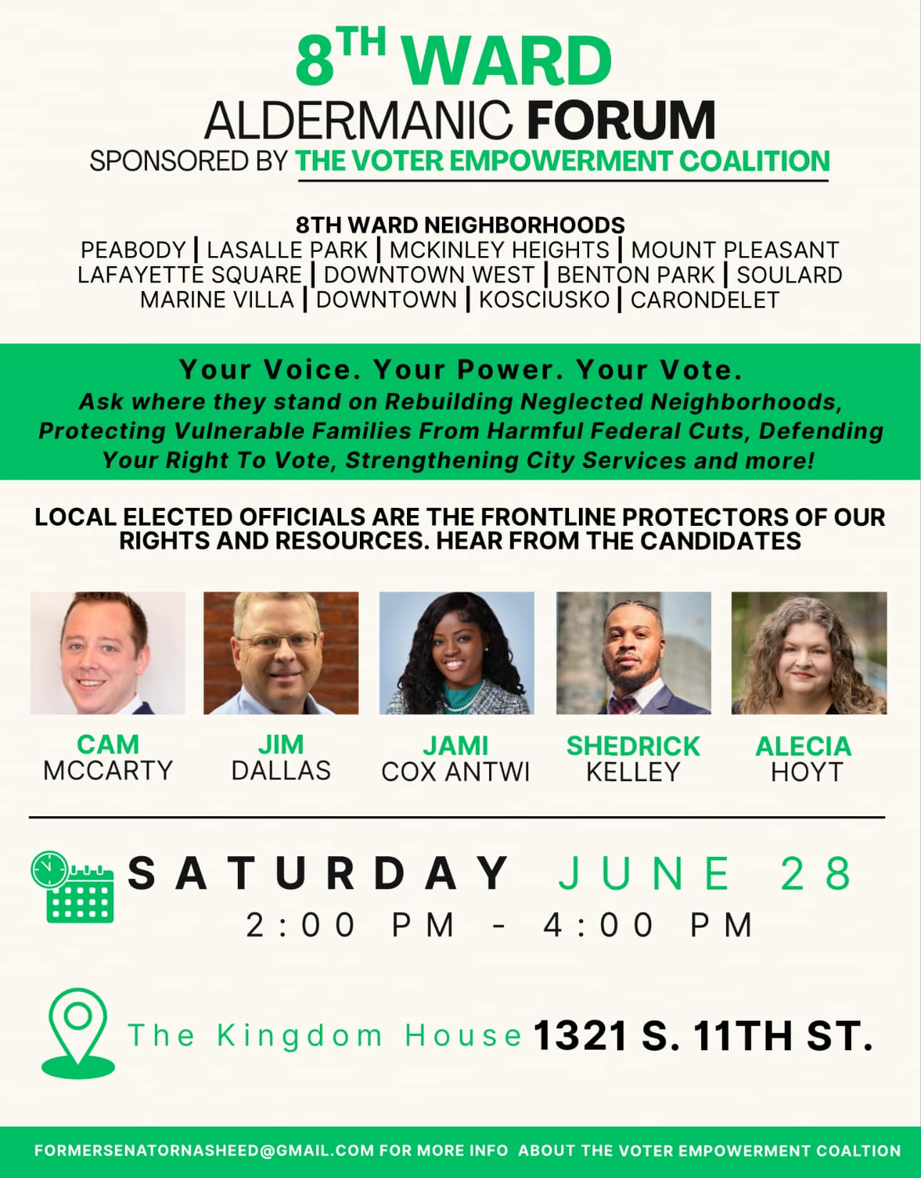 The future of the 8th Ward is in your hands. As we approach the special election on July 1, this is your final opportunity to hear directly from the candidates who want to lead our community. Join us for the last Candidates Forum before Election Day.