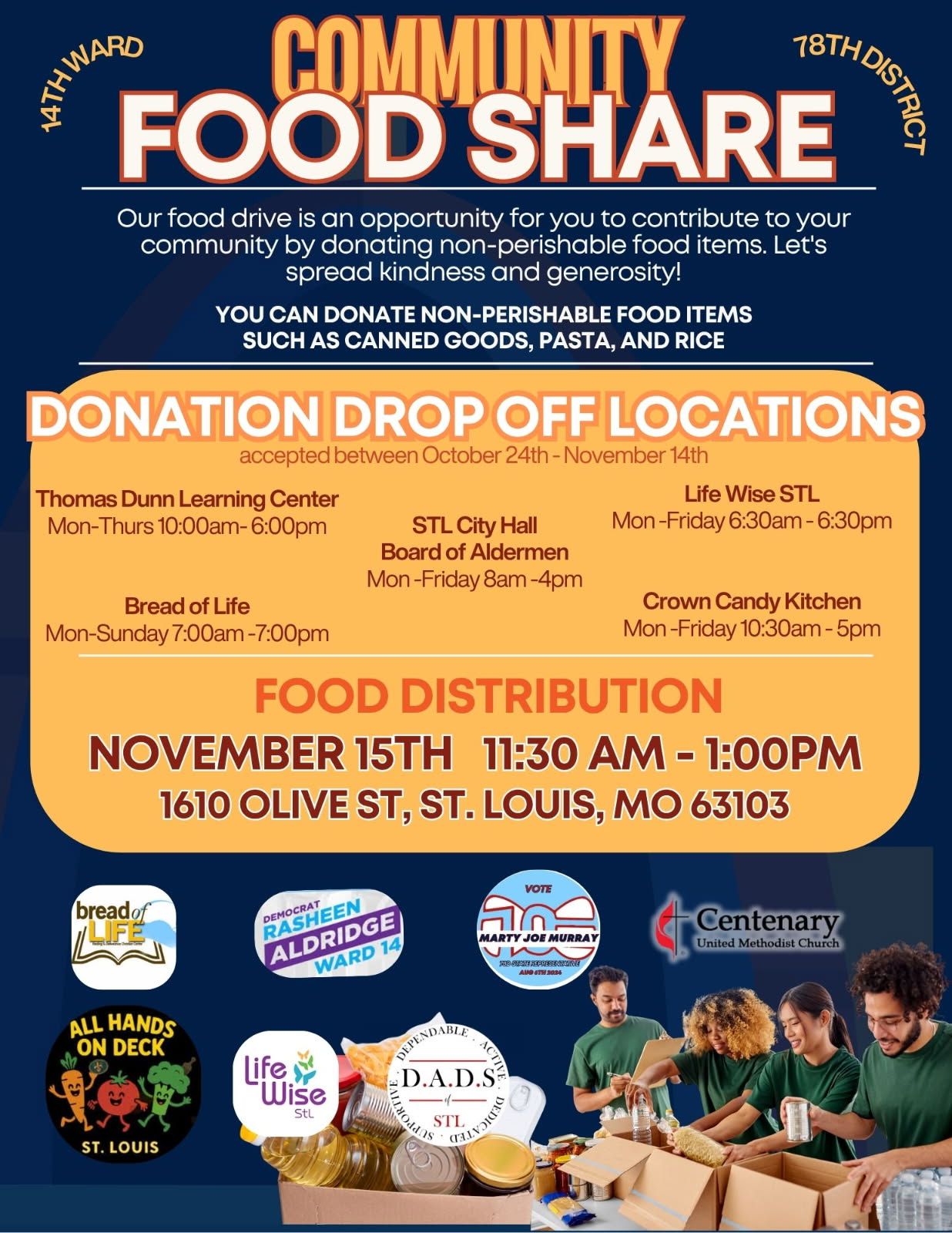 While SNAP is entirely funded by the federal government, each individual state is responsible for distributing benefits to its residents. Missouri receives approximately $130 million a month for SNAP, or about $1.5 billion annually. In order to address the gap I have partnered with some great organizations to host a Community Food Share and Food Drive on November 15th at 11:30am.