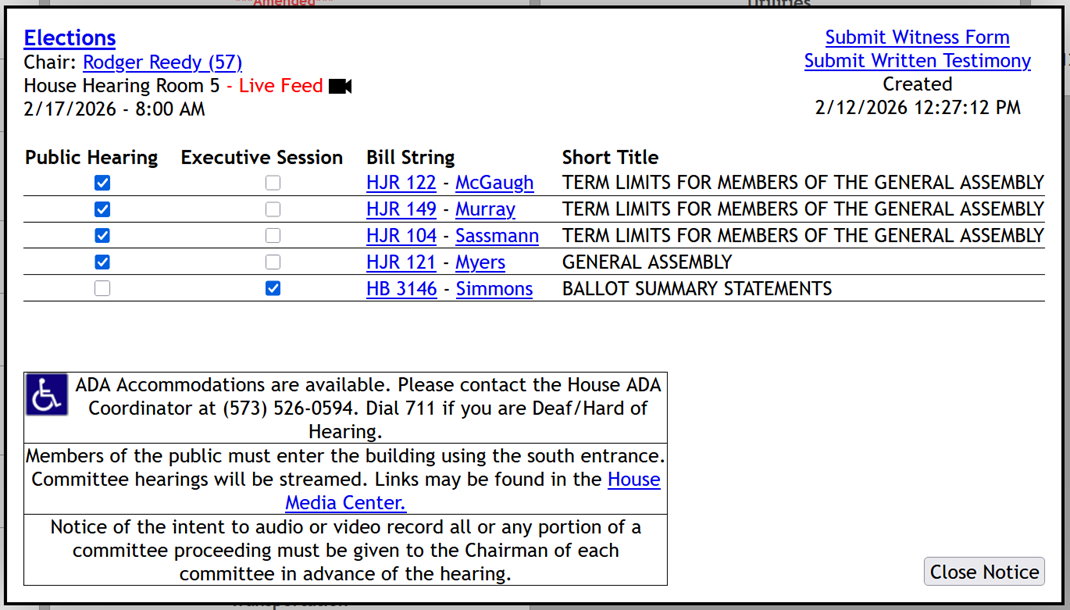 Hearing Notice: HJR 149 – Missouri General Assembly Term Limits: